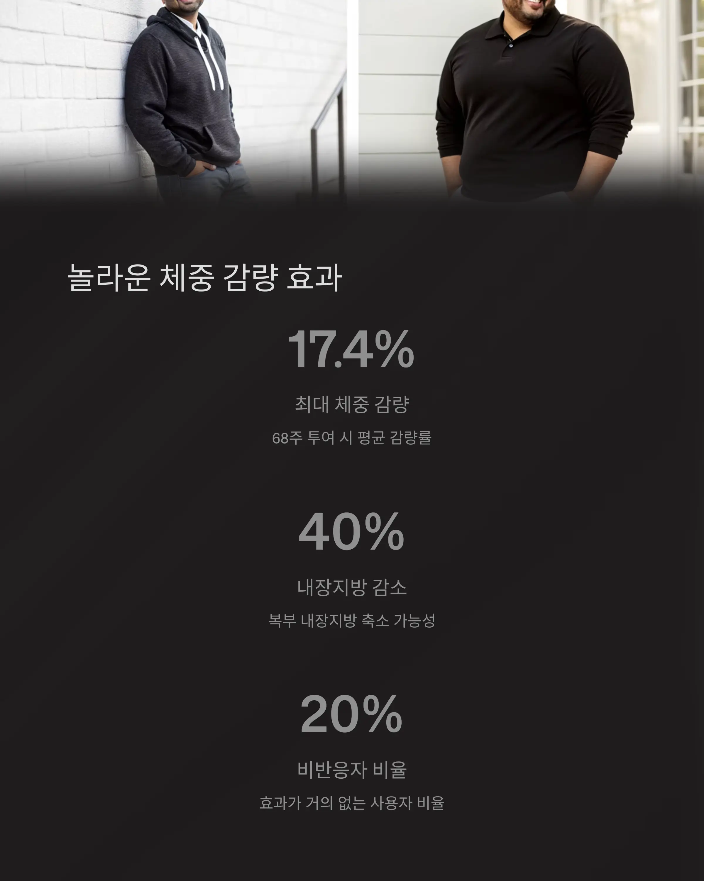 68주 투여 시, 평균 14.8%~17.4%의 감량 효과가 있었으며 일부는 20% 이상도 기록했습니다.