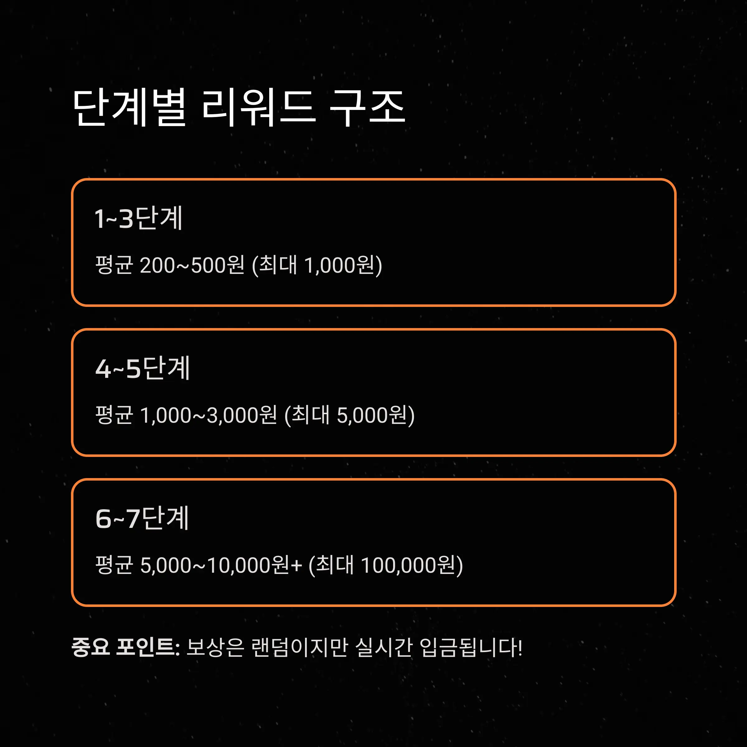 | 보상 | 단계별로 랜덤 현금 리워드 |