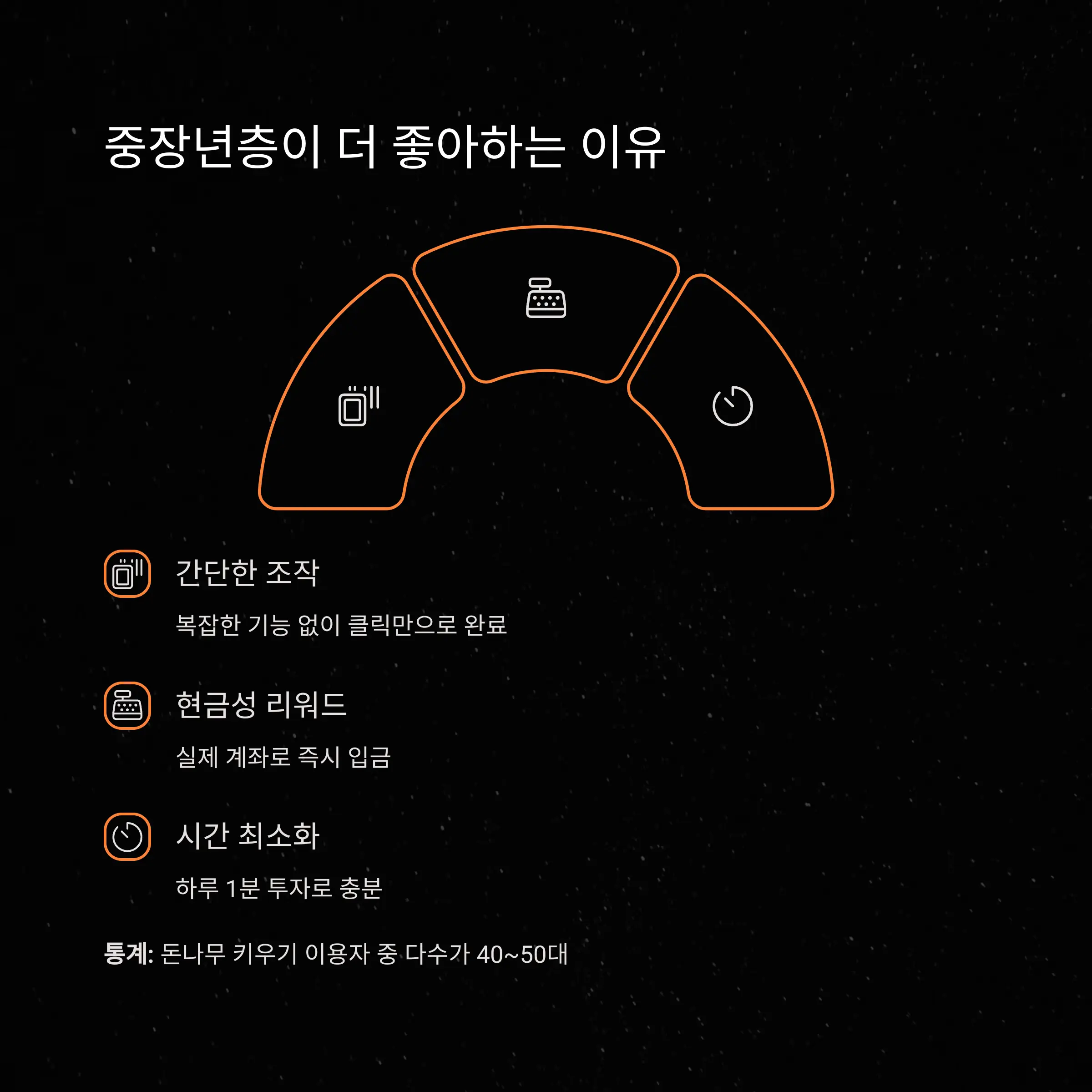간단한 조작, 현금성 리워드, 시간 투자 최소화 이 세 가지 요소로 인해 중장년층에서 참여율이 더 높습니다.