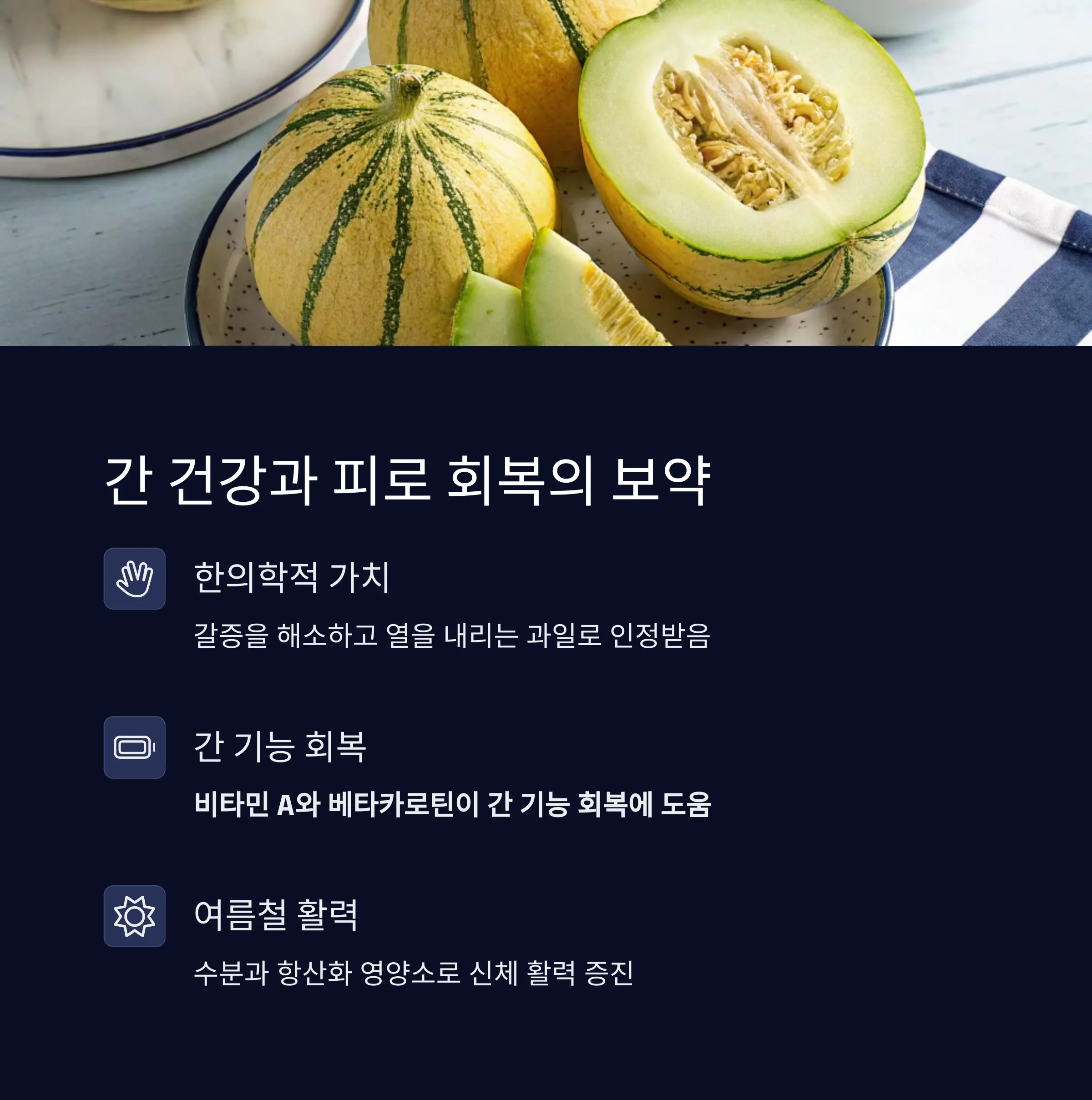 참외는 수분 공급과 함께 항산화 영양소로 신체 활력을 불어넣습니다.