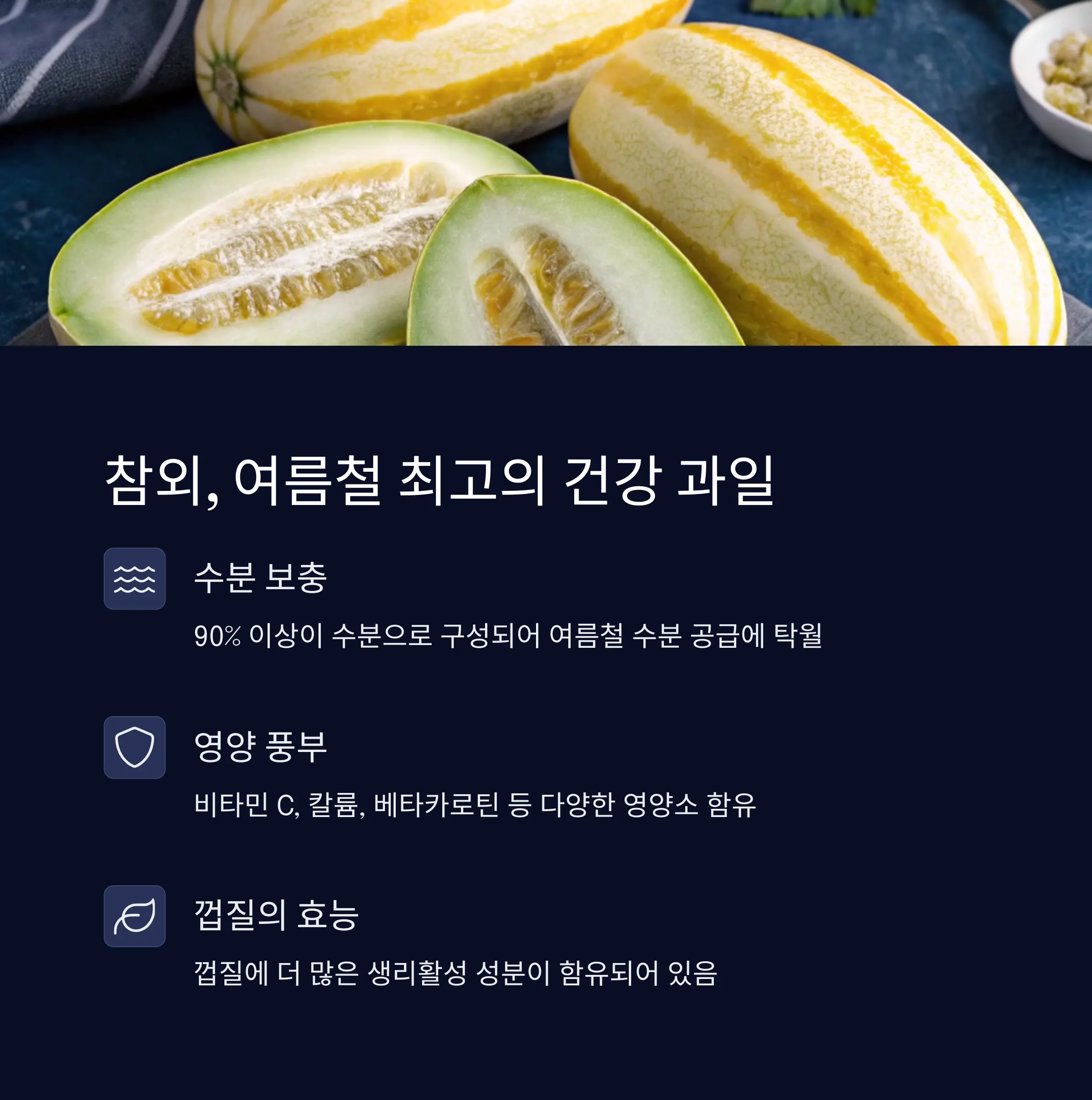 참외는 90% 이상이 수분으로 구성되어 있어 여름철 수분 보충에 탁월하며,