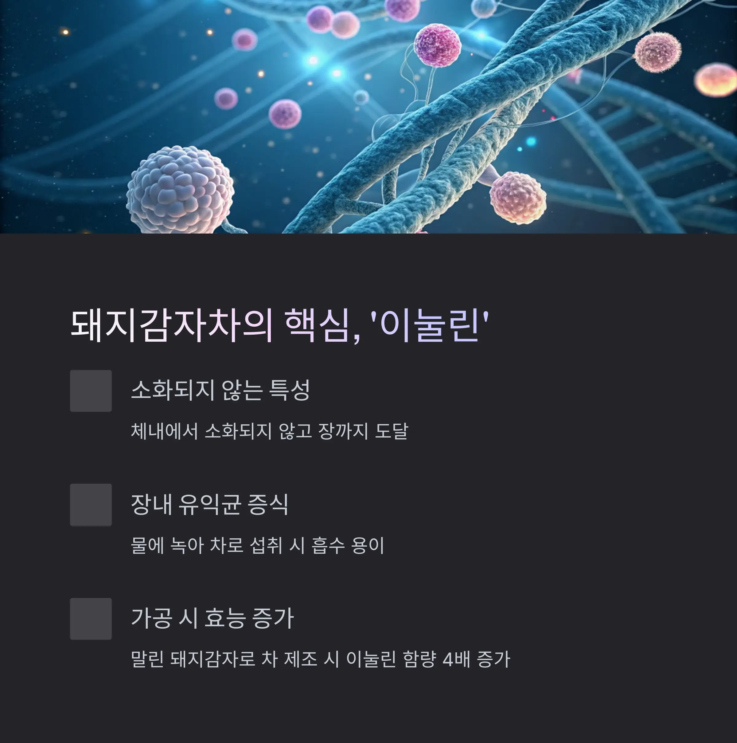 중요: "말린 돼지감자로 차를 끓이면 이눌린 함량이 4배 이상 늘어납니다."